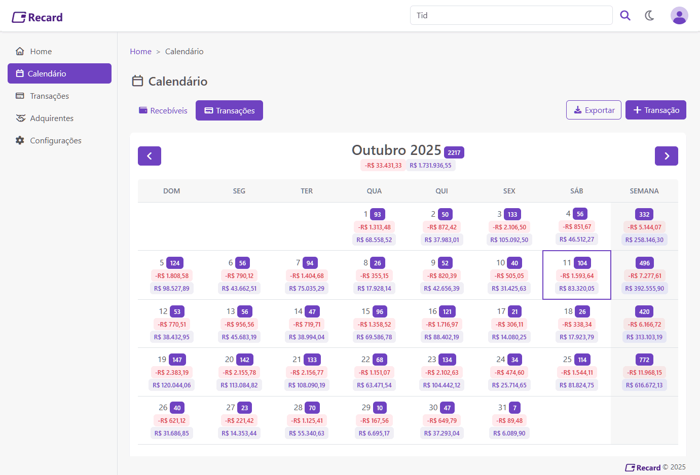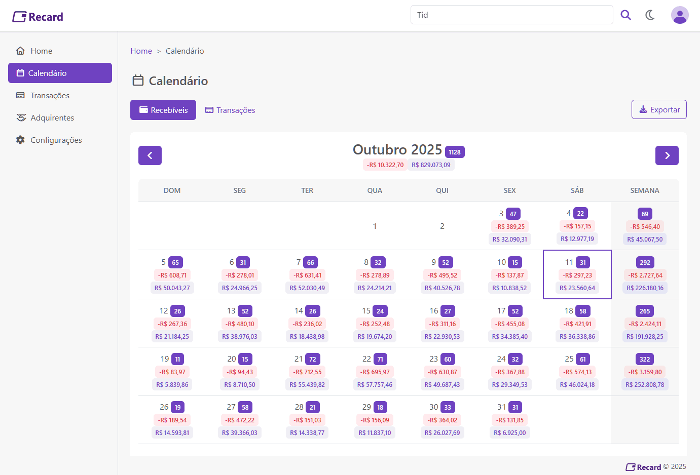 Visualize o valor total de recebíveis em cada data do mês. Tenha controle completo sobre quando e quanto você irá receber, facilitando o planejamento estratégico.