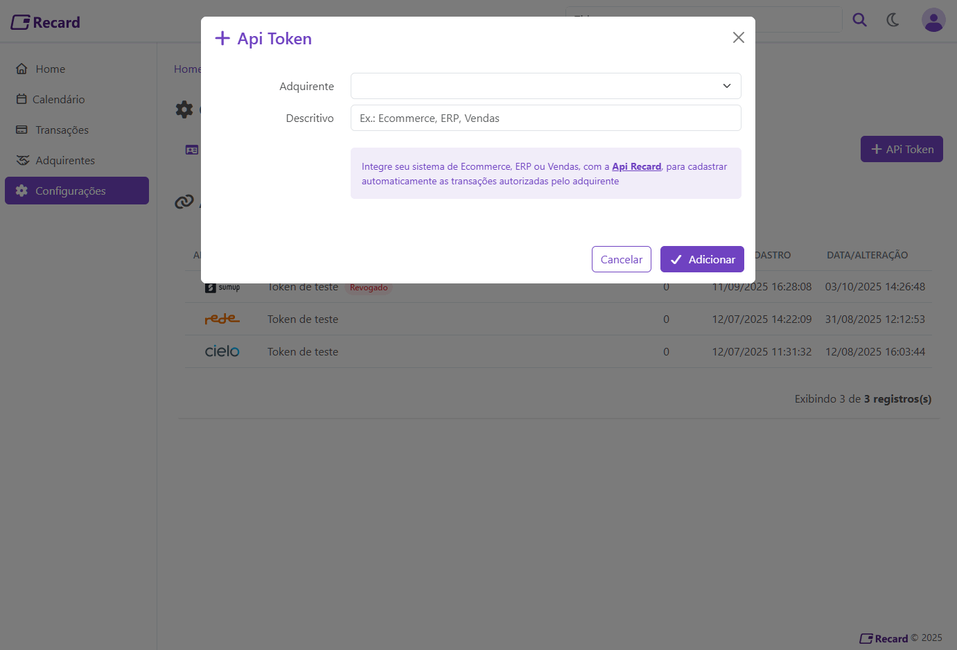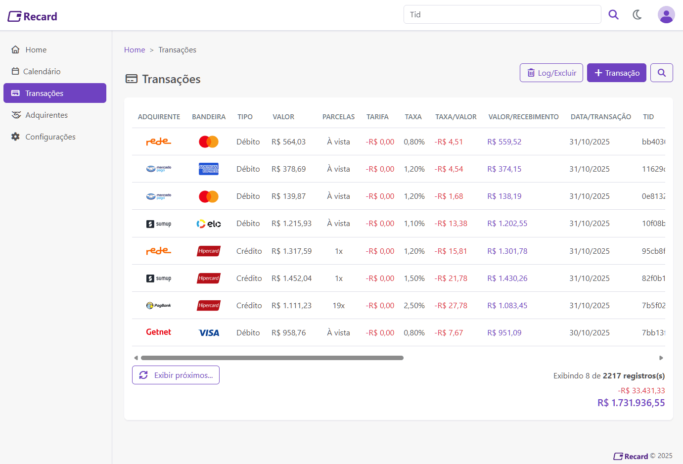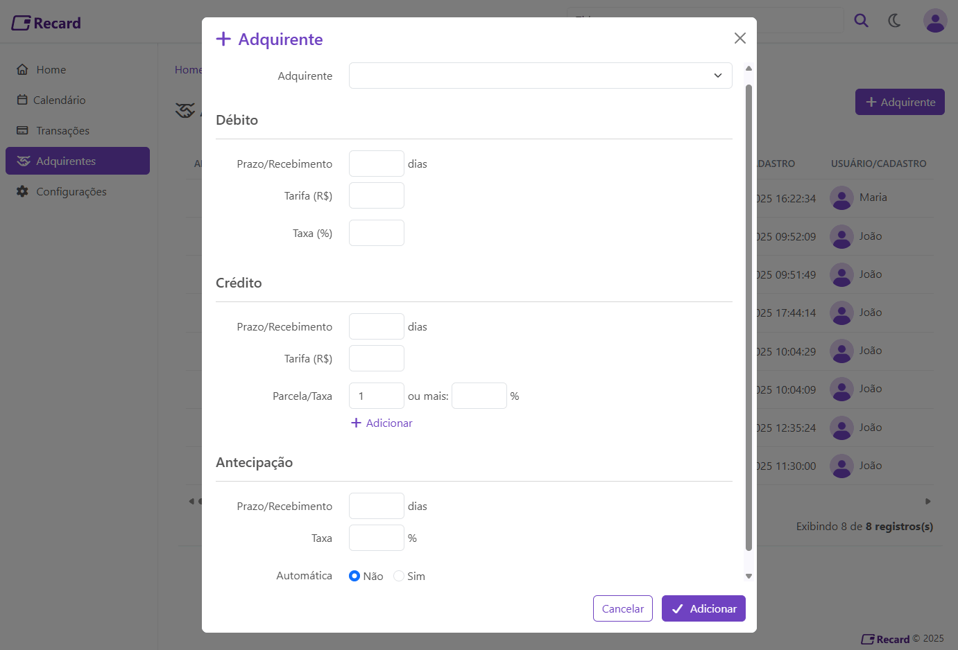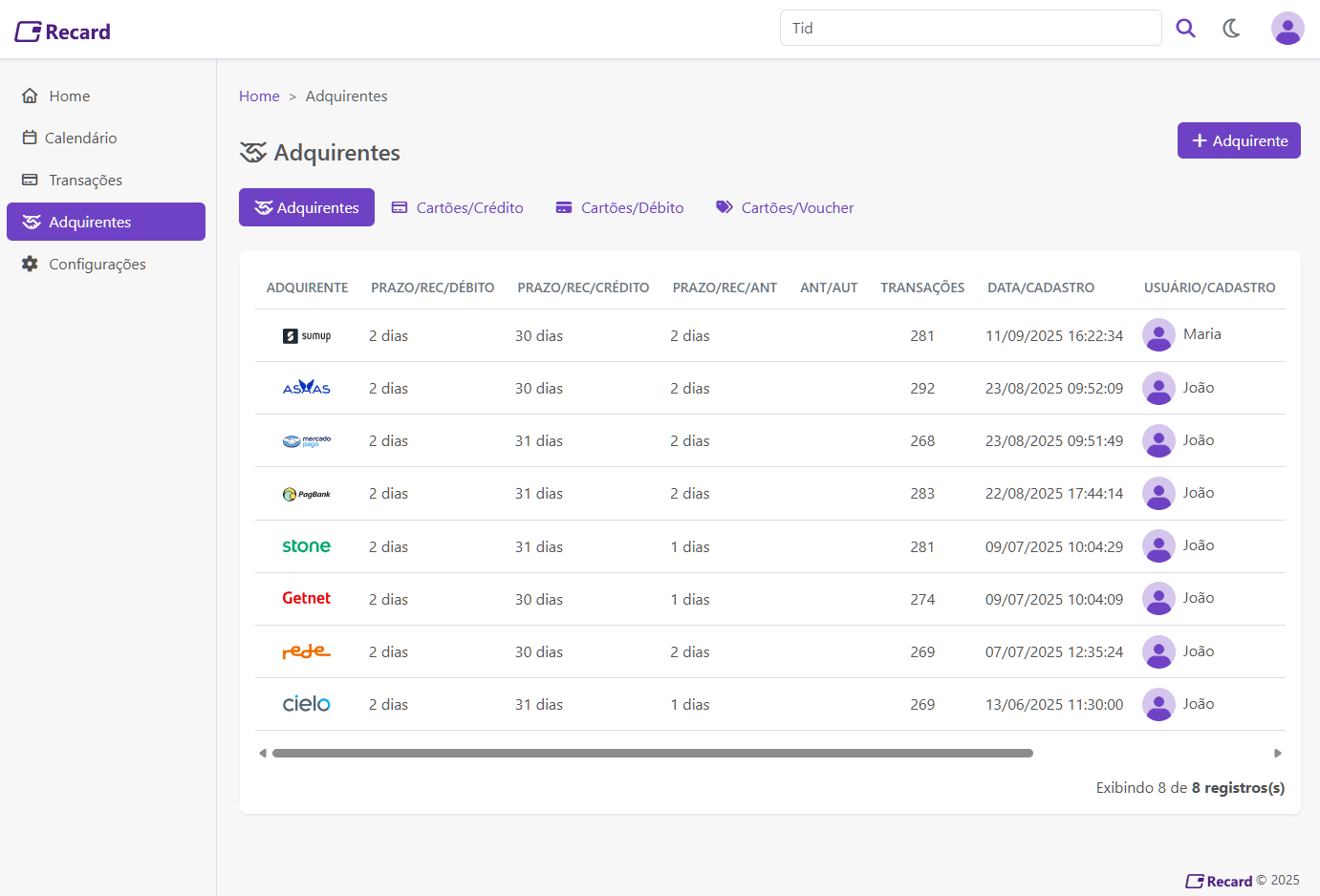 O Recard permite cadastrar múltiplos adquirentes. Assim você pode administrar em um único local todas as suas transações, independente do adquirente.